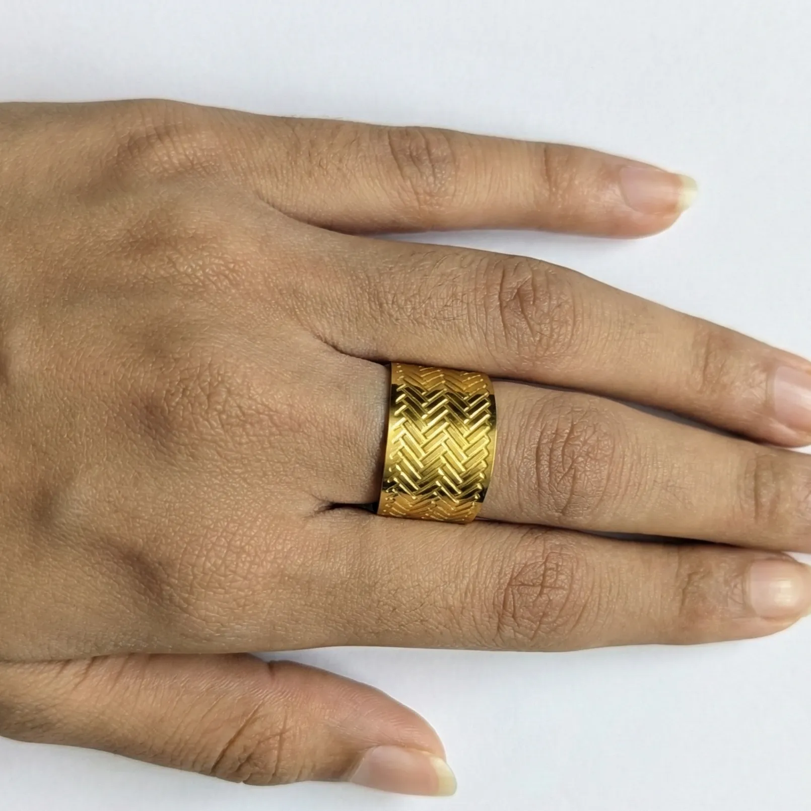 Timeless texture meets modern boldness. The Siena band is crafted for those who want their jewelry to speak volumes. Featuring an intricate, deeply engraved herringbone weave, this wide gold-tone ring catches the light from every angle, delivering a luxurious feel and a confident look on the hand.